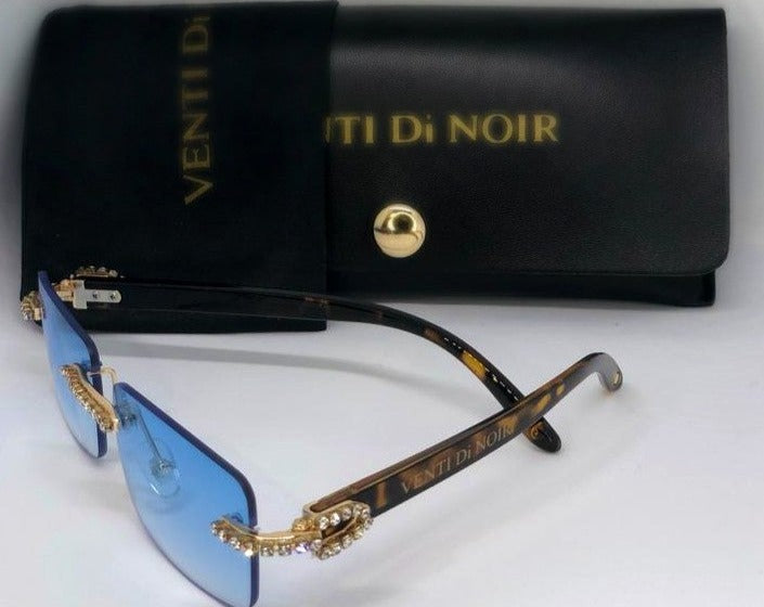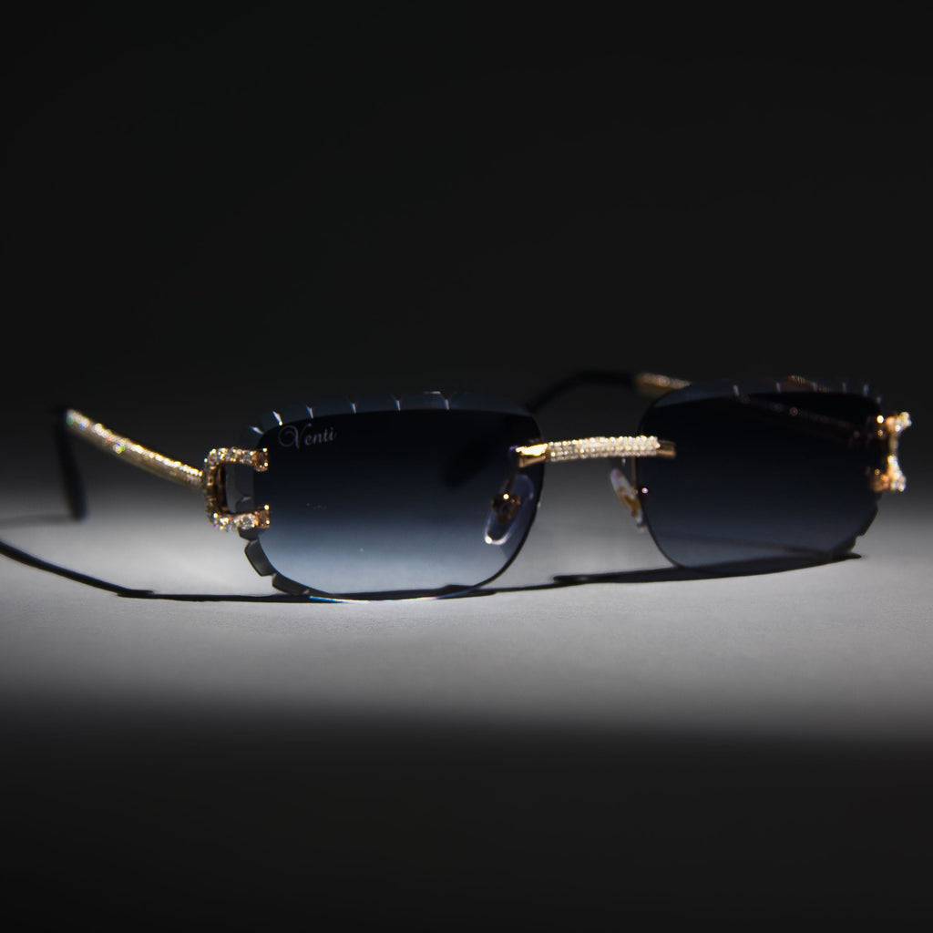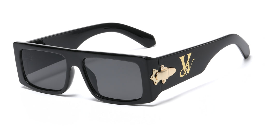 Rectangular sunglasses in black with "Venti Di Noir" logo printed in gold.